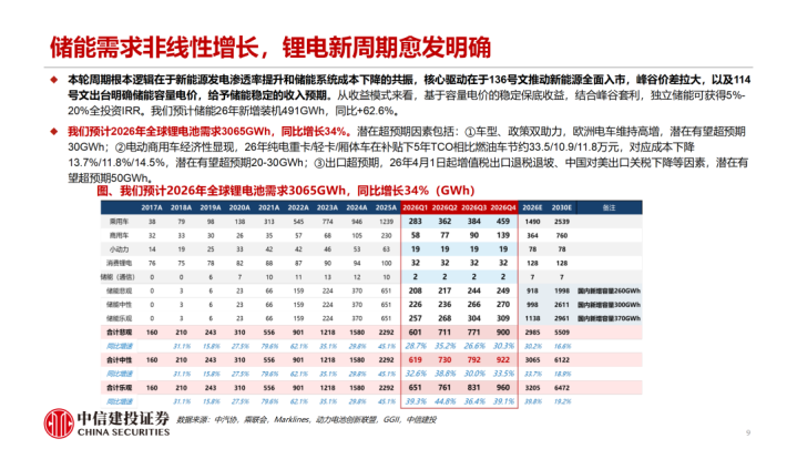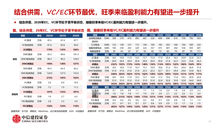 衔尾供需,咱们合计2026年EC、VC圭臬处于紧均衡气象,跟着旺季降临VC/EC盈利才调有望进一步擢升。需求端:锂电新周期越发明确,储能需求渐渐照进施行。咱们瞻望2026年各人锂电板需求3065GWh,同比增长34%,带动电解液需求快速擢升。中期来看,咱们瞻望至30年锂电板合座需求保管19-20%的同比增速。供给端:溶剂圭臬,咱们瞻望26年EC/DMC/EMC有用供给为93/129/134万吨,对应供需比约106%/127%/162%。添加剂圭臬,26年咱们瞻望VC/FEC有用供给约11/5万吨,对应供需比约107%/118%。