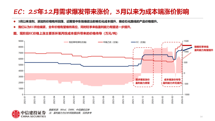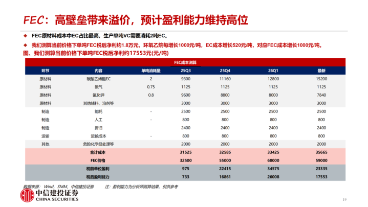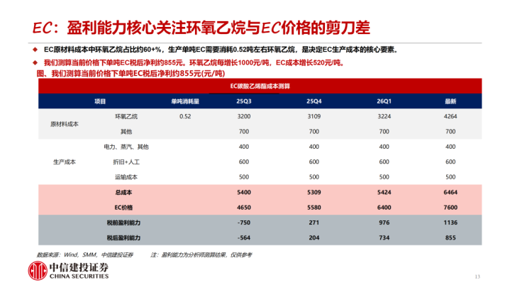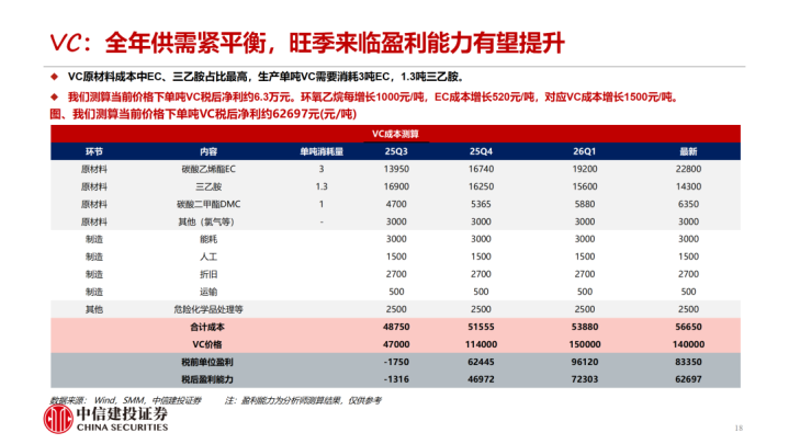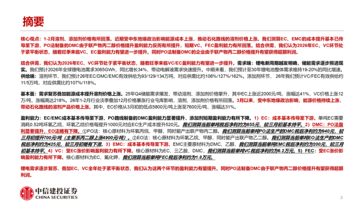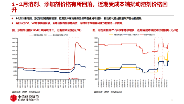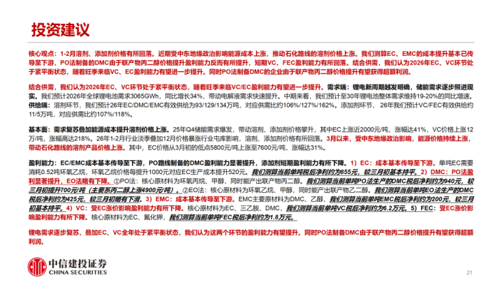 1-2月溶剂、添加剂价钱有所回落。近期受中东地缘政事影响动力老本高潮,股东石化道路的溶剂价钱高潮。咱们测算EC、EMC的老本擢升基本已传导至卑劣,PO法制备的DMC由于联产物丙二醇价钱擢升盈利才调反而有所擢升,短期VC、FEC盈利才调有所回落。衔尾供需,咱们合计2026年EC、VC圭臬处于紧均衡气象,跟着旺季降临VC、EC盈利才调有望进一步擢升。同期PO法制备DMC的企业由于联产物丙二醇价钱擢升有望得到逾额利润。