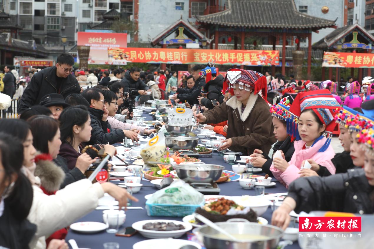 2月8日,广西河池市大化瑶族自治县古江社区达吽小镇广场干与超卓,瑶族秉性长桌沿广场铺展,七百弄鸡经典菜品系数摆盘亮相、香气氤氲,成为现场一起亮眼的场面线。